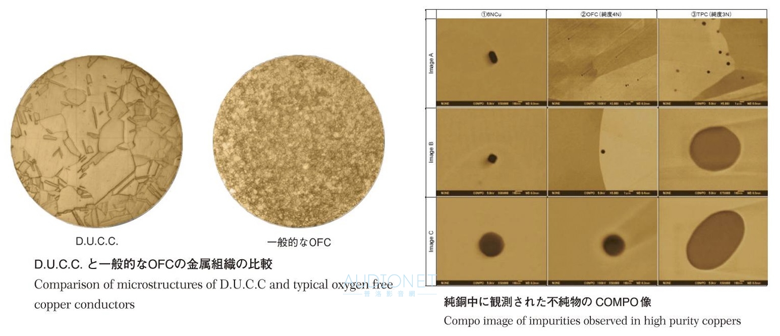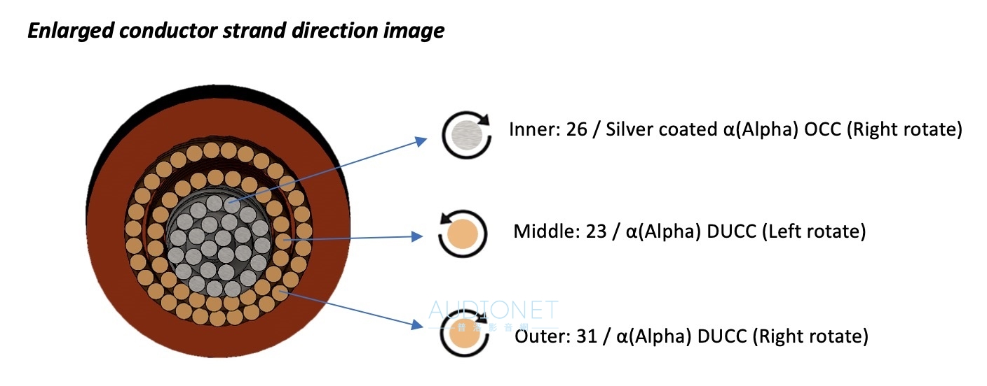 来到Project V1-L XLR最关键的线身结构,看到它的剖面图会惊讶地发现,原厂真的把电源线的结构移植到讯号线上了!从内层开始,有正、负两条独立的导线,每条导线以镀银a-0CC与a-DUCC两种导体组成。单一导线中的导体一共有三层导体,最内层是26股的多芯镀银a-OCC导体,朝右旋方式绞绕。再来中层为23股线径的a-DUCC,朝左旋绞绕。最外层为31股的a-DUCC採右旋制成,外部再用音响级的PP聚丙烯材质做绝缘。其中OCC单结晶铜导体大家都很熟悉,而DUCC超结晶铜导体目前只用在Project V1系列上,它是由日本三菱工业研发,能透过精确晶体排列并最大限度地减少晶体断面影响传导效果,也是Furutech工程师在目前市面上能找到最好的导体材料之一。两种导体经过Furutech的Alpha程序加工后再加以调和以达到更完美的传导特性。