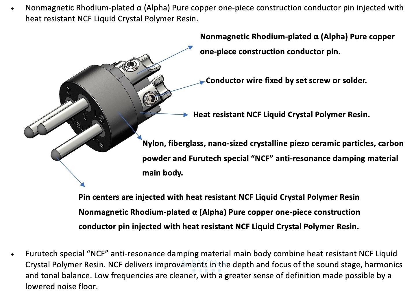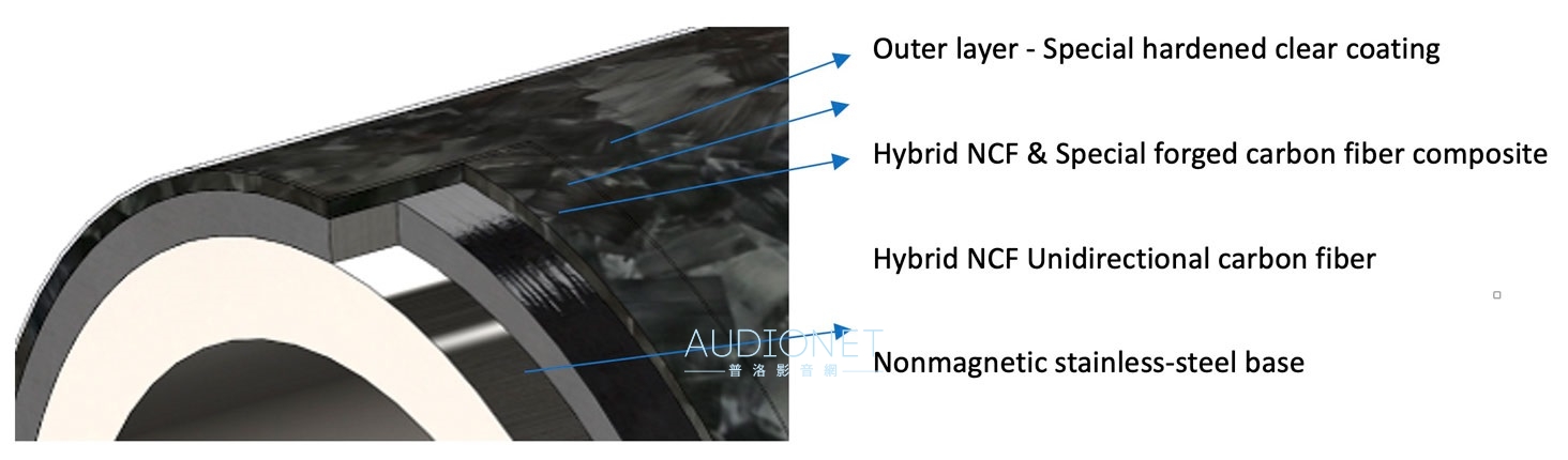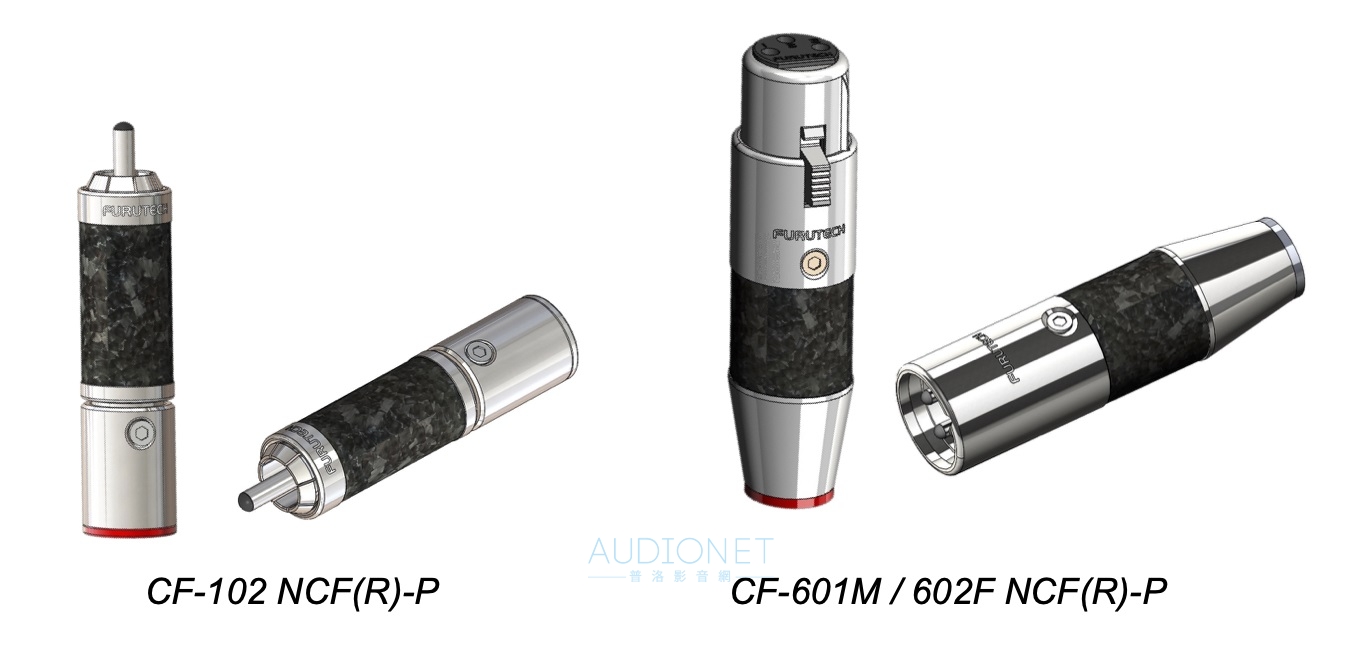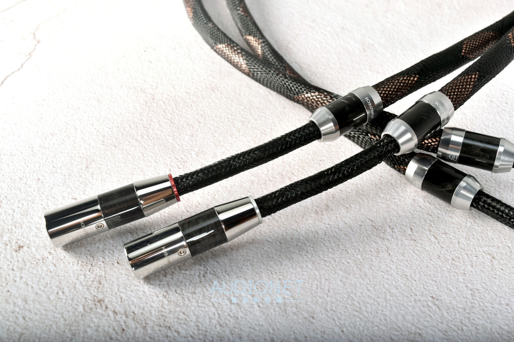 再看到此线的XLR端子,採用的是Furutech目前最顶级的CF-601M/CF-602F NCF(R)-P,可别小看这小小的XLR插头,内部蕴藏著丰富的NCF技术。首先端子外壳採用黄铜冲压制成,外面再镀铑以增加硬度,端子所有能看到的黑色的塑料都是NCF树脂结合奈米陶瓷和碳粉阻尼材料,具有抗静电、抑振的功能。端子腰身上还有一圈碳纤维造型,这其实是由四层材质堆叠而成,由内而外,第一层是不导磁的金属结构,再来两层都是NCF与碳纤维混合制成,最外部则是特殊硬化透明阻尼涂层。且此端子是Project V1专用的特殊版本,没有单独贩售,碳纤维纹路呈现不规则的造型,看上去更具独一无二美感。