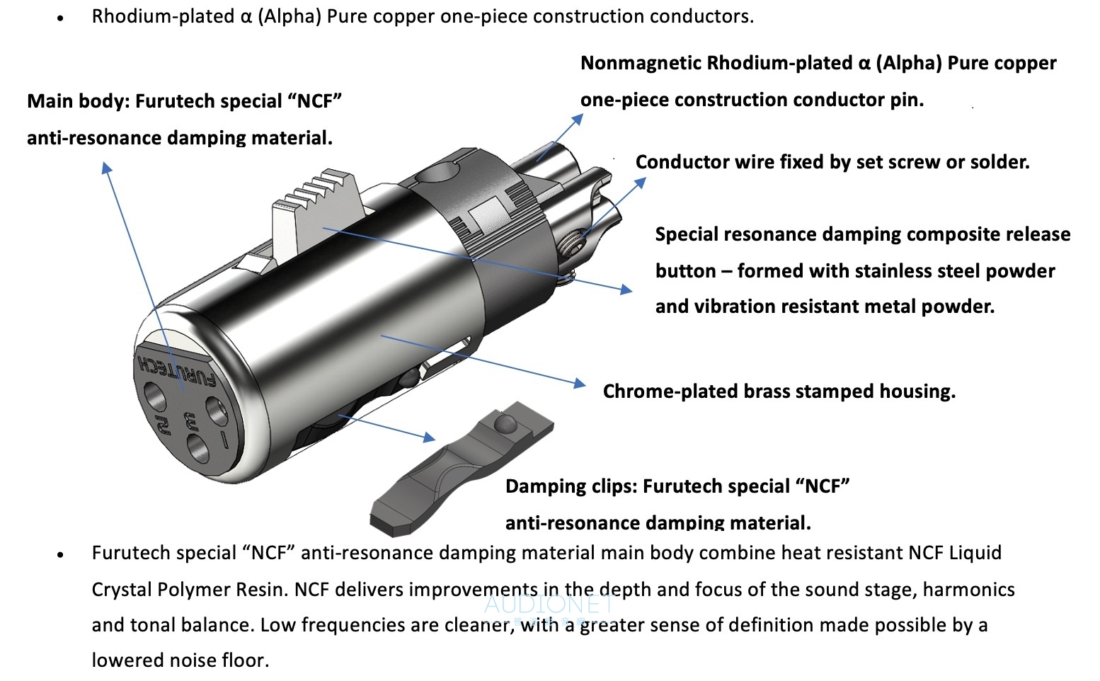 接著端子内部的导体夹片和XLR的三个接脚为一体成形的Alpha纯铜制作,接脚为中空设计,内部也灌有NCF树脂。而所谓alpha工艺的第一步骤是透过液态氮或氨气进行冷冻,达到-196至-250°C的极低温,再缓慢的回温,能藉此消除金属内部的应力,使金属结构更紧密。第二步骤则是透过大型的机具,将零件做消磁处理,增强纯铜的导电特性。