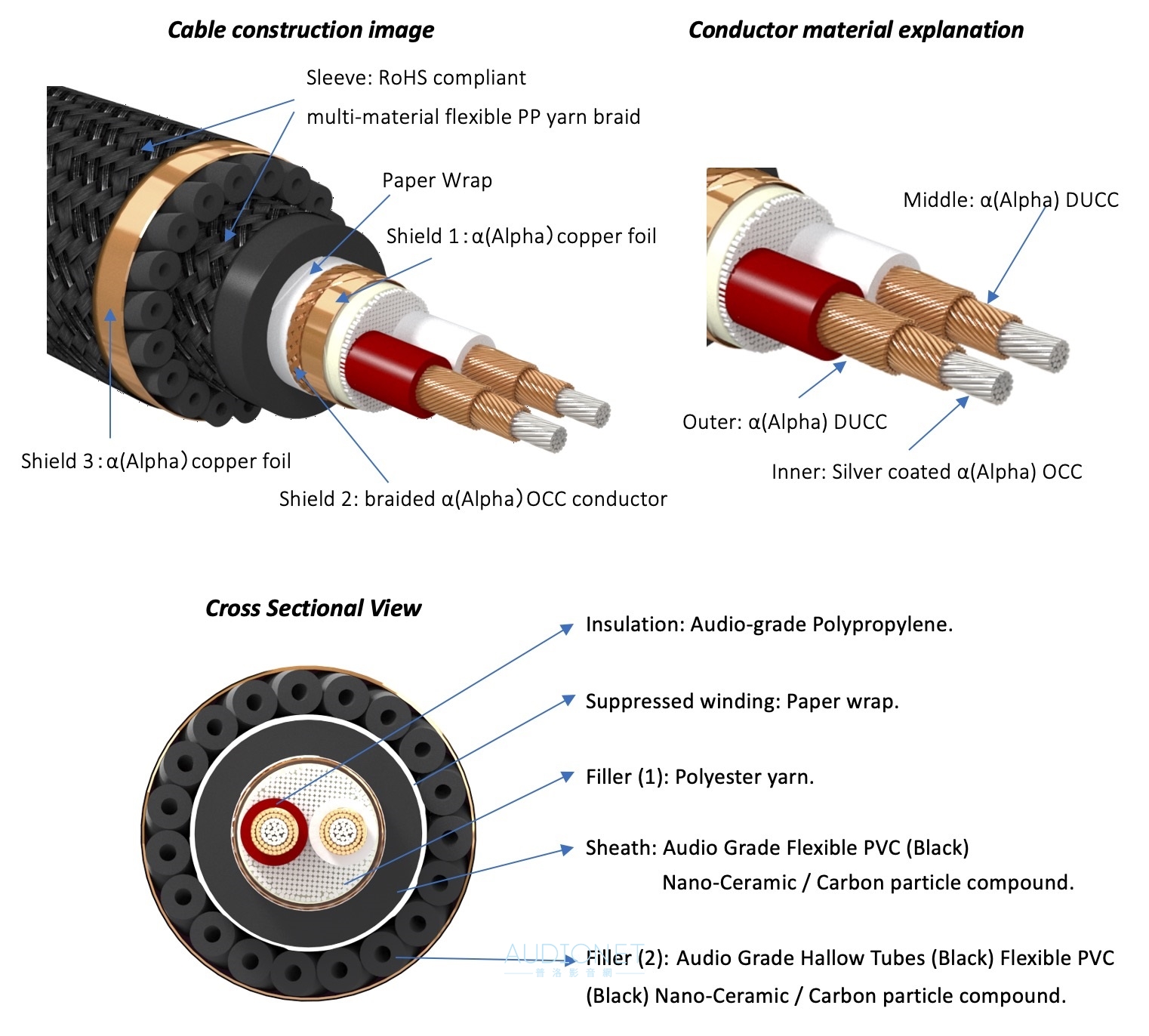 黑色绝缘外部採用一层尼龙纤维编织包覆,增加线身的阻尼特性。接著外面再用19根中空的碳纤维PVC塑料阻尼管围绕排列在外部,这个设计非常关键,它不仅为线材提供很好的缓衝效果与阻尼特性,其中空的结构也创造出很多空隙,可形成“空气绝缘”的效果,比起寻常的PVC、PE等绝缘材质,空气绝缘能达到最低的容抗与感抗,让讯号的传导更佳无往不利。