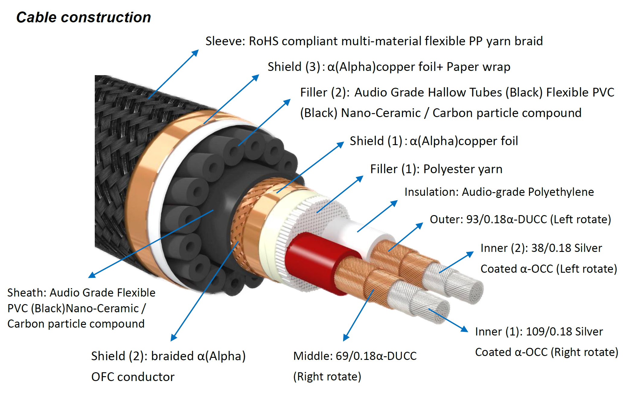 最内层核心导体为109芯/0.18镀银α-OCC,採用顺时针方向绞绕,包围其外面的是38/0.18芯镀银α-OCC,但为逆时针绞绕,再来是69芯/0.18 α-DUCC,顺时针方向绞绕,再来是93芯/0.18 α-DUCC,逆时针方向绞绕,接下来的5~12层分别使用不同材质来处理干扰、隔离、化震与保护等作用,材质与使用的地方也都经过Furutech的研发与聆听才决定。导体之外的8层包括了绝缘(Insulation)、3层屏蔽(Shield)、2层填充(Filler)、护套(Sheath)及最外层的隔离保护编织网。