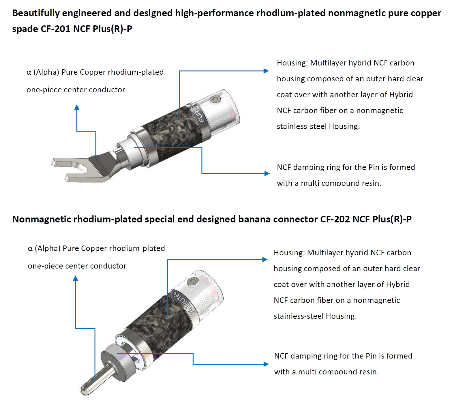 喇叭端子为Project-V1-S专用之特别版本,也是Furutech最高等级的产品,包括Y插CF-201 NCF Plus(R)-P与香蕉插CF-202 NCF Plus(R)-P,我们试听的为喇叭端香蕉插,扩大机端为Y插,用家可以视自己系统情况跟店家选购端子要怎麽样配置。端子的主要导体使用一整块完整的镀铑α(Alpha)纯铜所制成,端子外壳採用Furutech独家NCF及多种材质、多层结构所组成,包括无磁不锈钢,外壳本体之最外层施高硬度之透明膜所包覆。