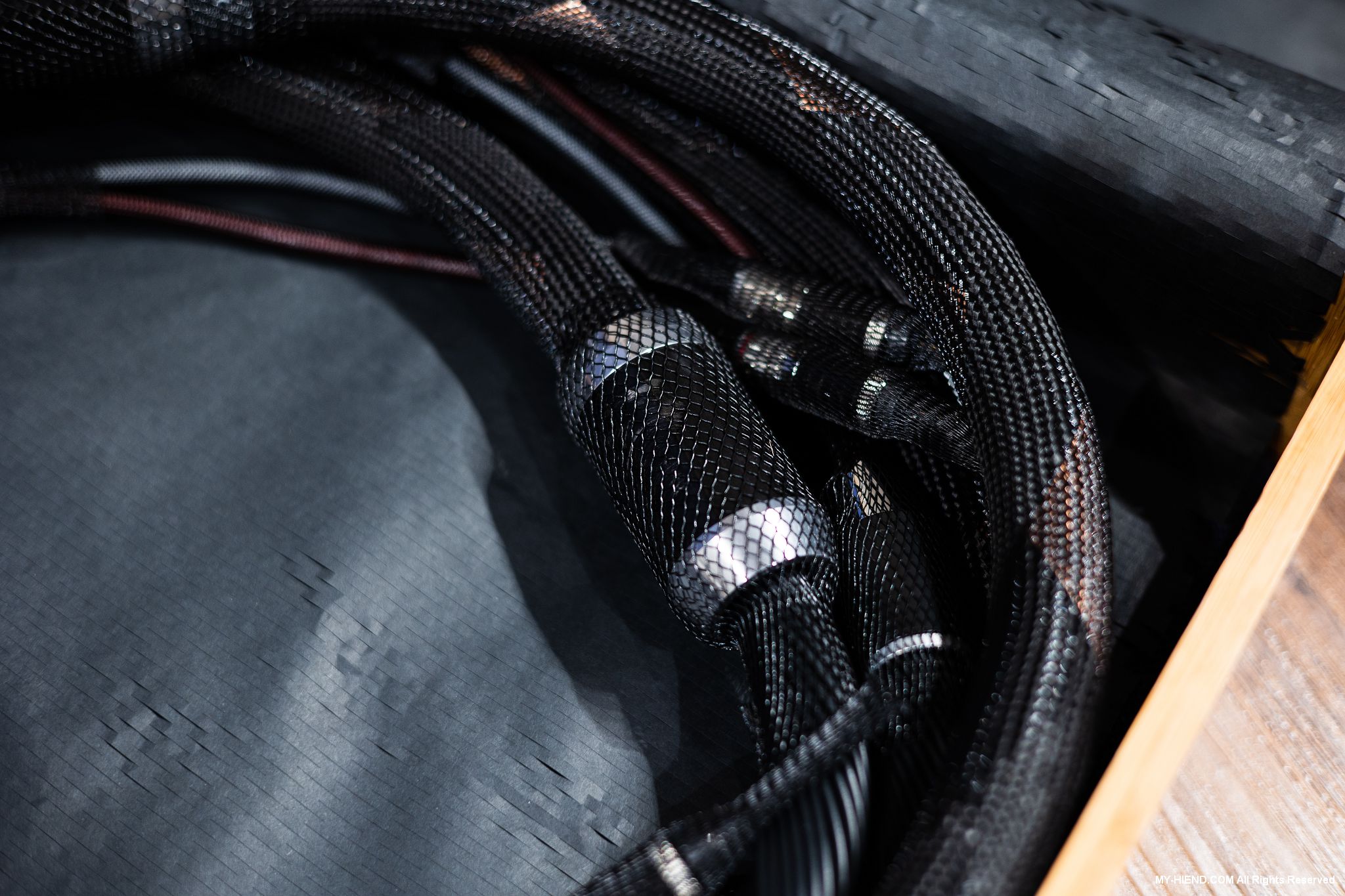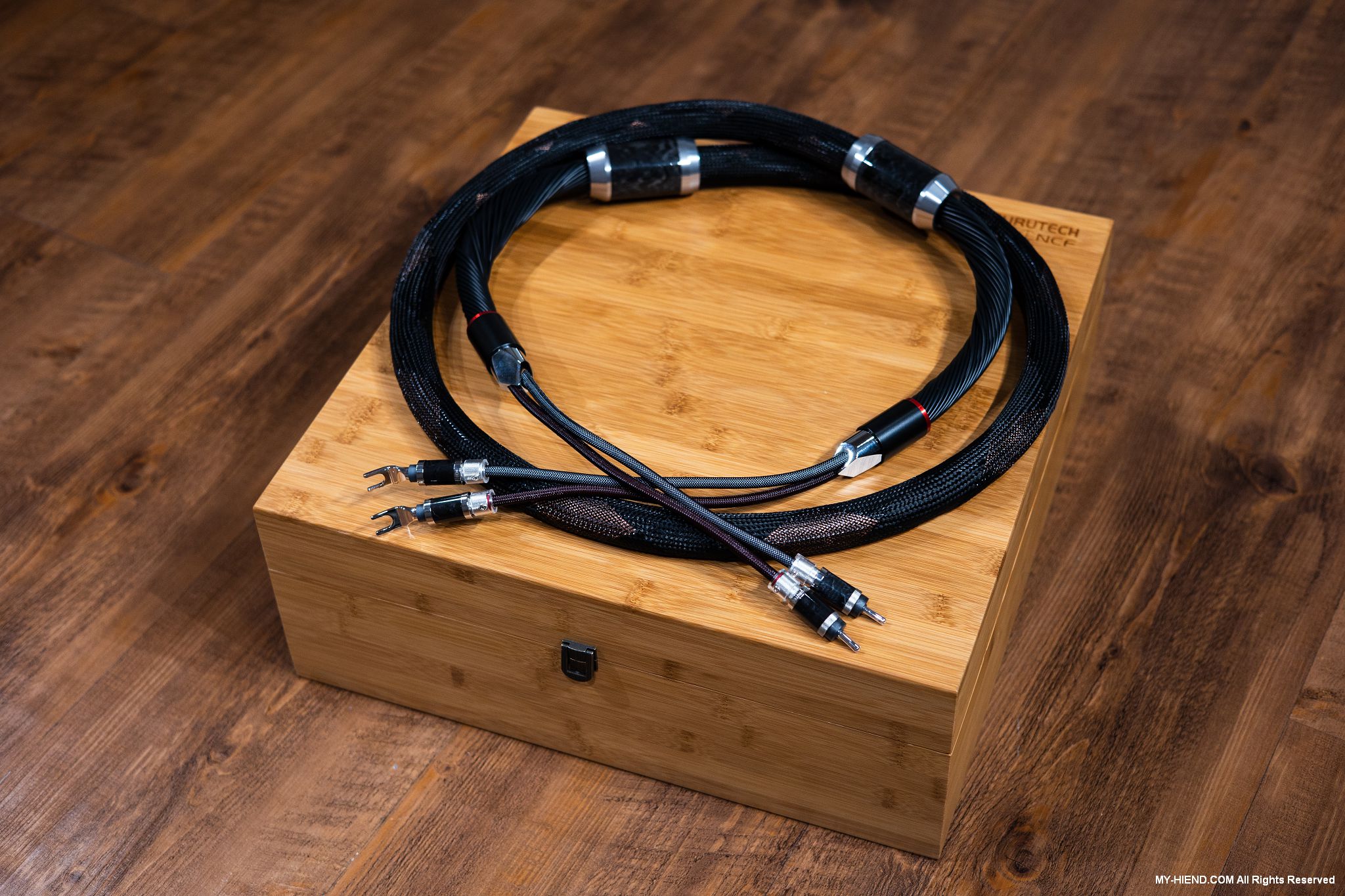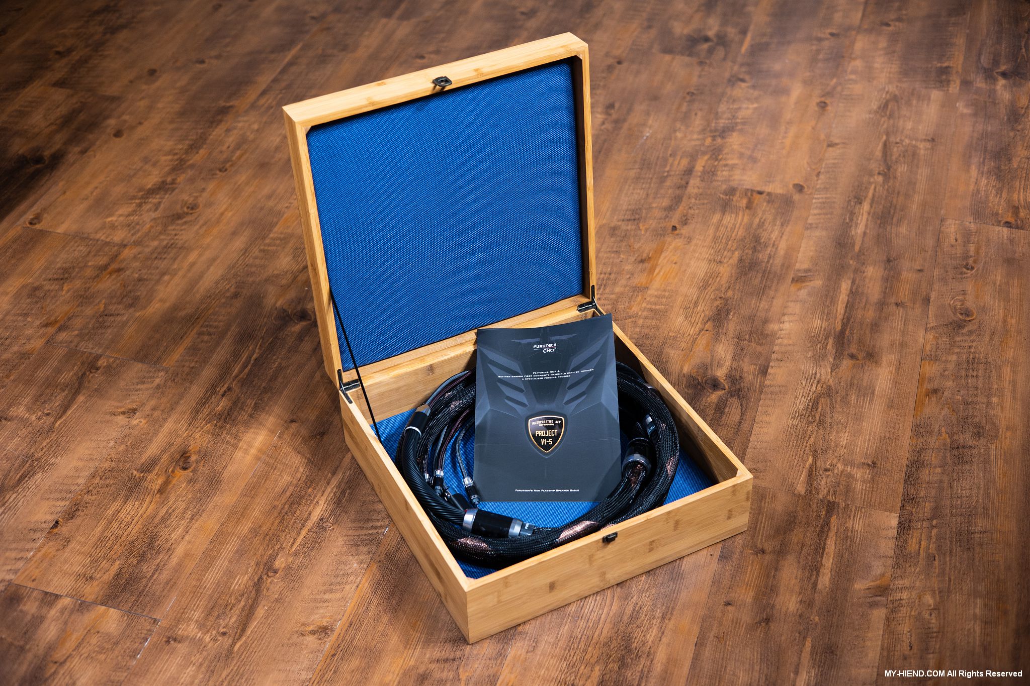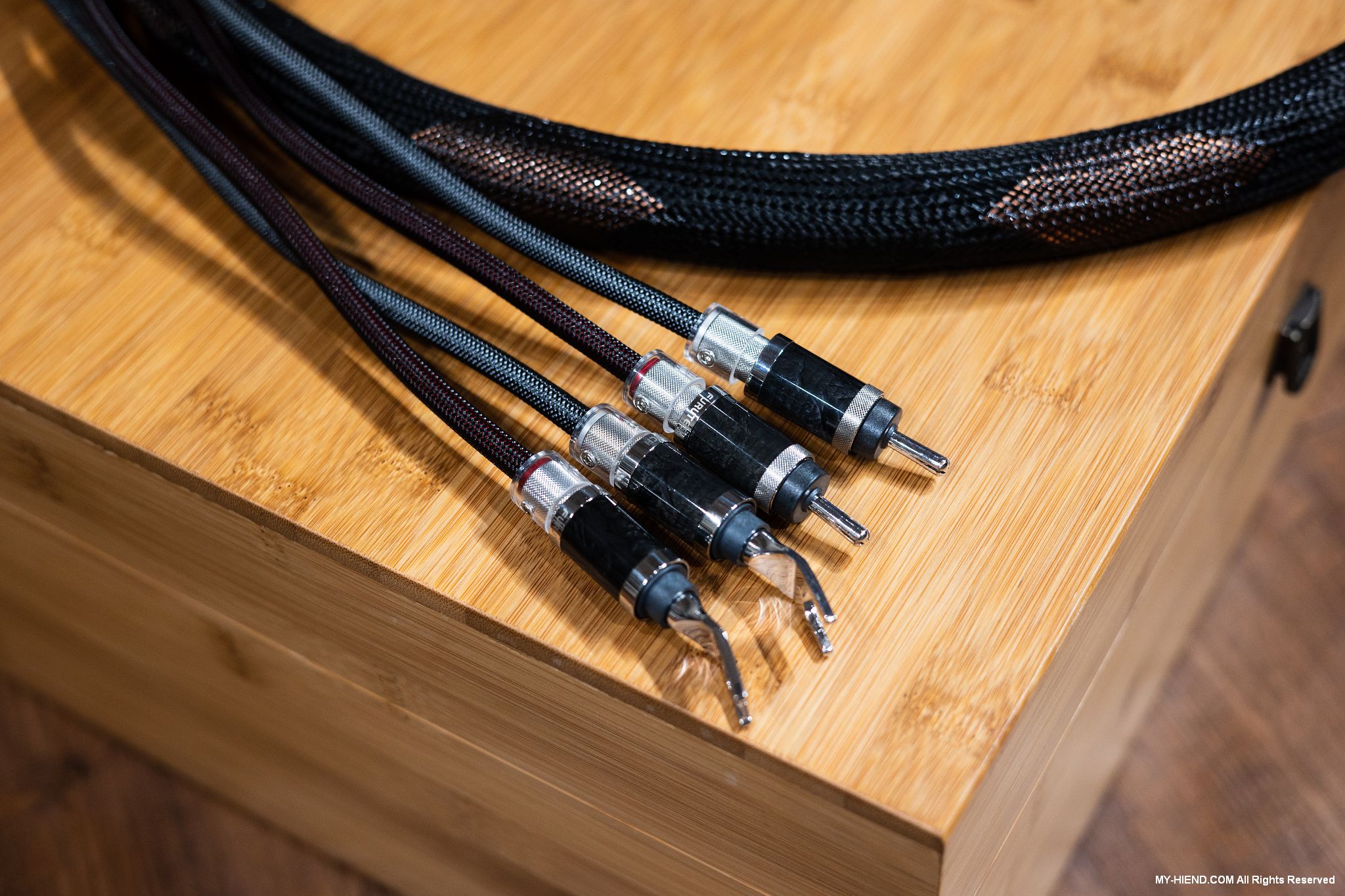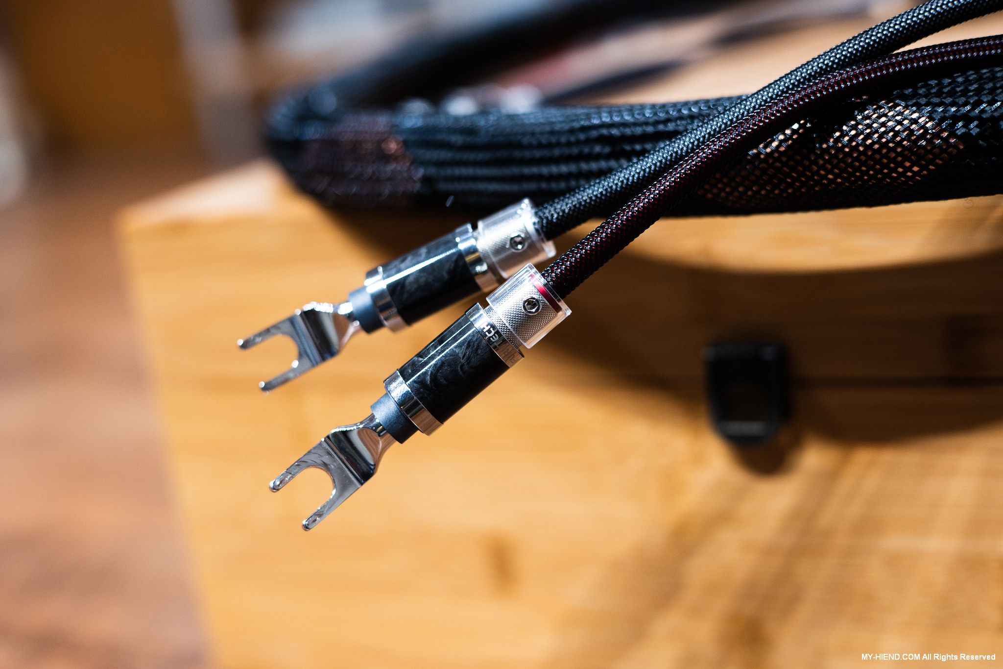 Furutech Project V1-S旗舰喇叭线的外盒採用重量十足的木制包装,打开后上下叠著一对精美而低调的喇叭线,线材整体颜色大多是深色与黑色,从外观上看得到碳纤维阻尼环与完整的包覆,端子连接头上看得出使用独家NCF材质,NCF是由奈米级陶瓷与碳纤维粉末制作,能融入运用在各个部位以各种型态出现。线身虽然算是粗,但保持著优异的柔软性,弯曲时比视觉上看起来更柔和,这对线材一端是Y插、一端是香蕉插,因此在接线时非常方便使用。
