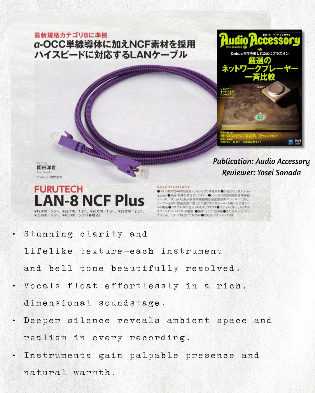 尽管定价亲民,LAN-8 NCF Plus 却呈现出真正的高端级声音素质——一条足以匹配最严苛音响系统的网络线材。
